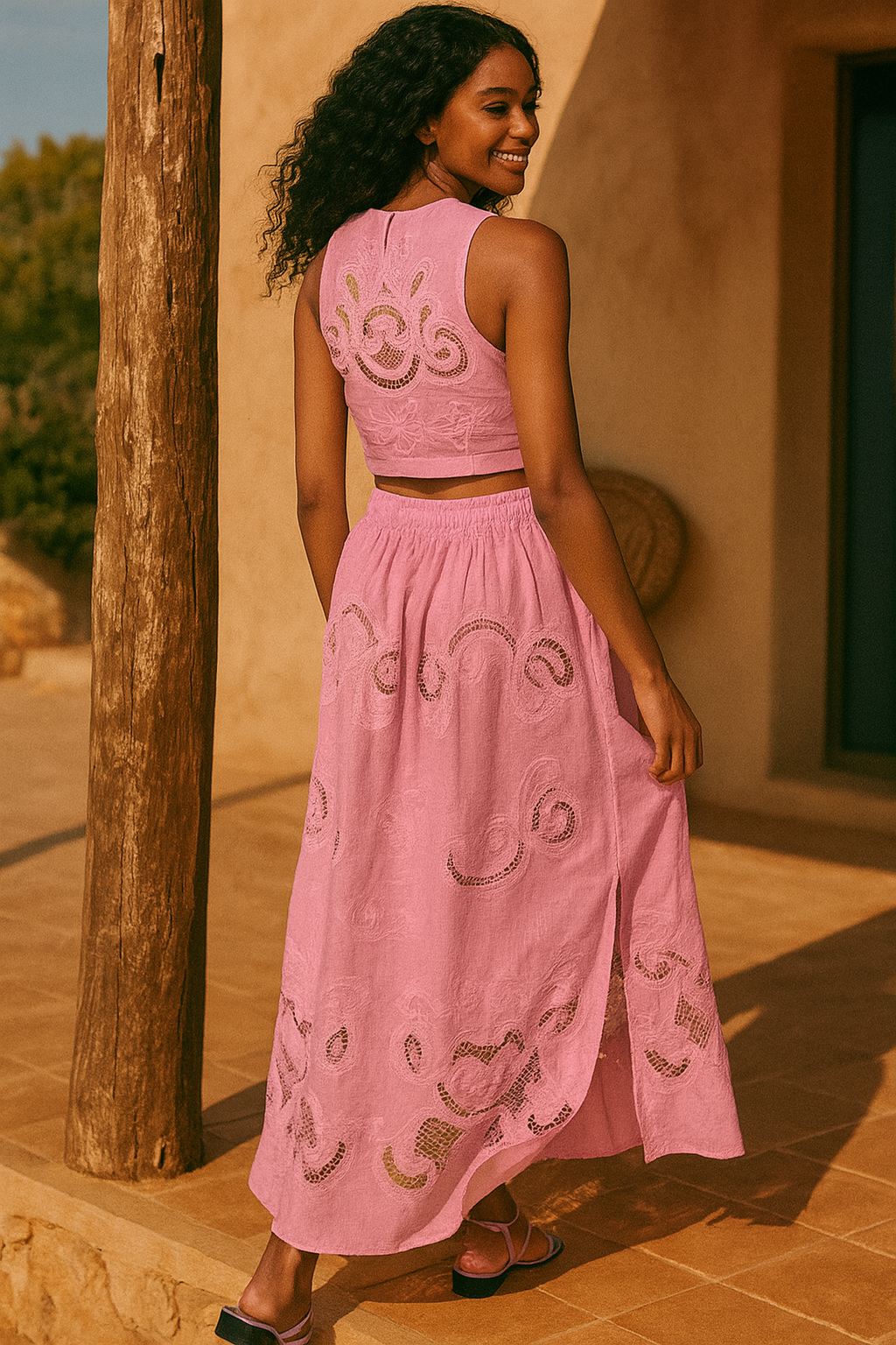Su suave tonalidad rosa pastel lo convierte en el aliado perfecto para días luminosos, almuerzos despreocupados o escapadas inolvidables. Combinado con sandalias y accesorios de materiales naturales, el conjunto Alicia ofrece un estilo boho chic refinado, siempre listo para destacar con naturalidad. 🌿✨