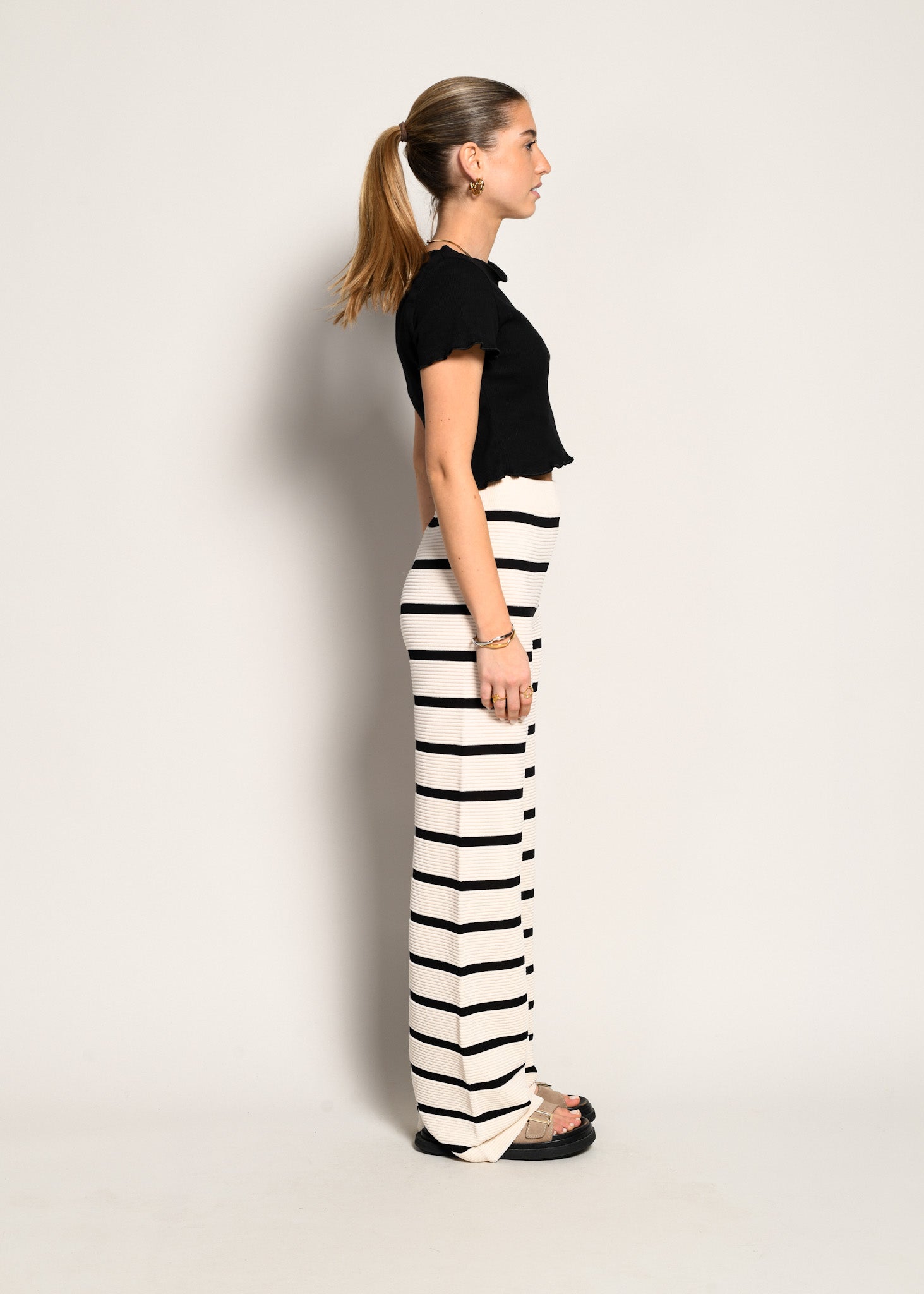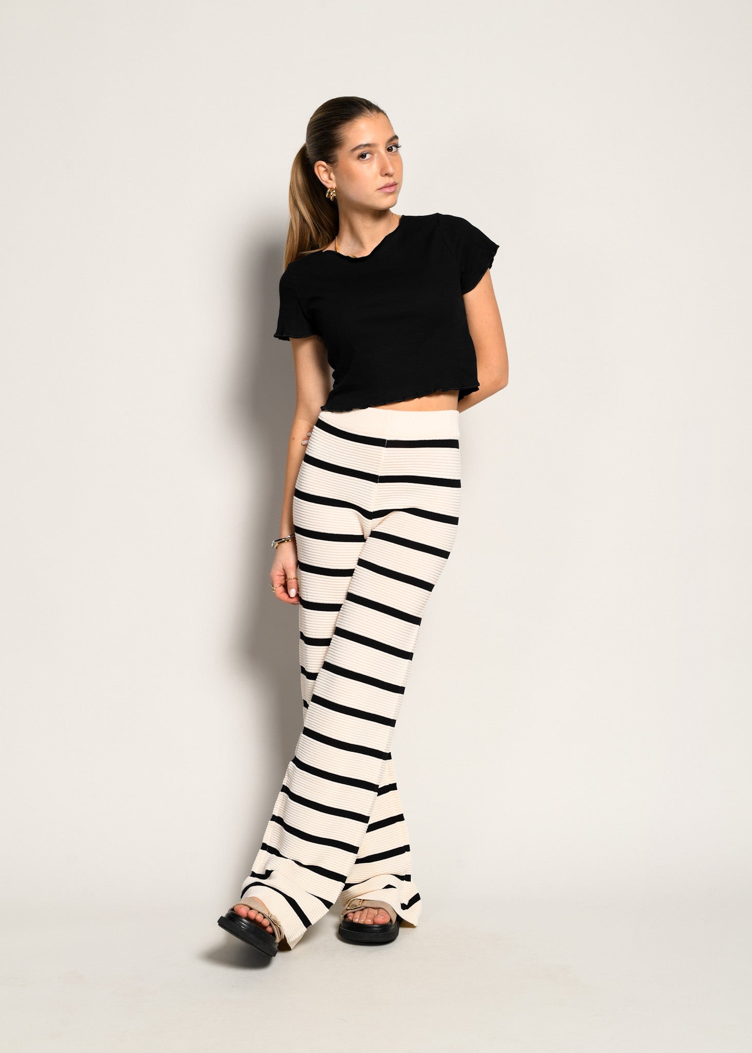 El pantalón Alexandra interpreta la comodidad con una dosis de estilo gráfico. De tiro alto y confeccionado en un delicado punto canalé beige con rayas negras horizontales, combina suavidad, estructura y un encanto atemporal. Su corte recto fluye con naturalidad, acompañando la silueta con una caída elegante y sin restricciones.
